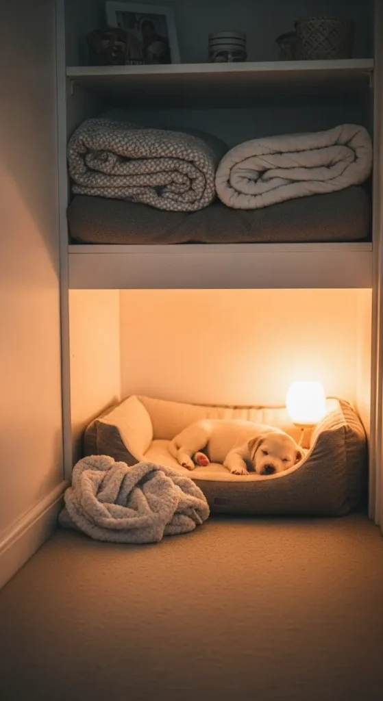 A quiet calm-down corner helps puppies self-regulate when they feel overstimulated. Soft blankets and minimal distractions create a soothing space.