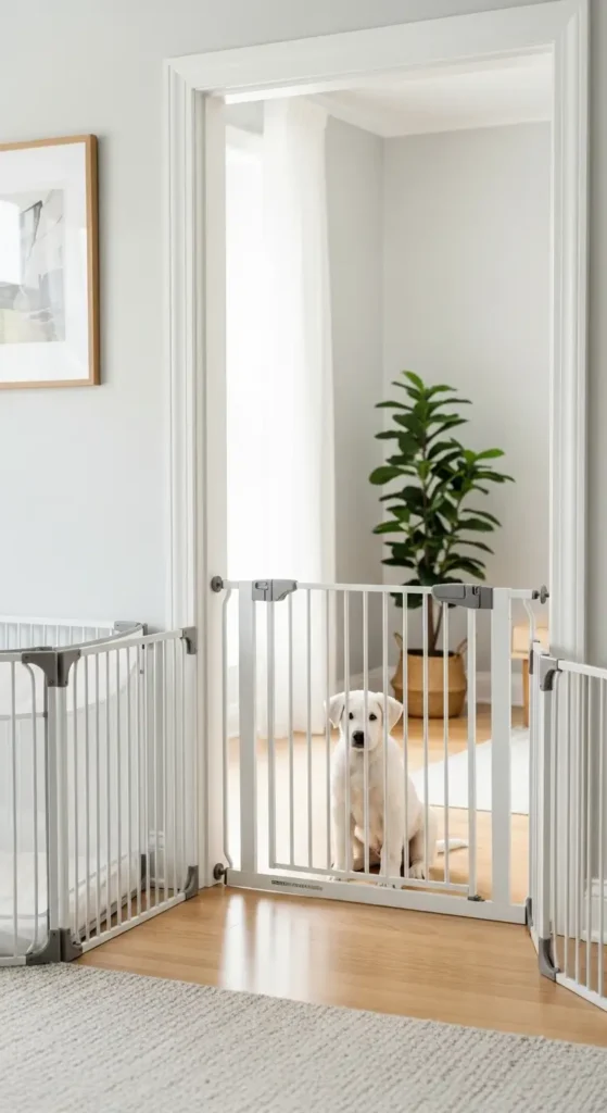 Barriers help define the puppy room and prevent access to unsafe areas. Gates allow visibility while maintaining boundaries.