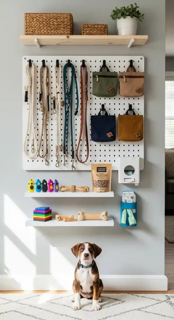Wall-mounted storage keeps leashes, treats, and supplies within reach but out of puppy’s way.
