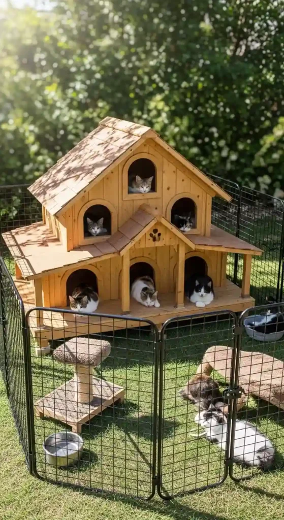 Larger shelters designed for multiple cats provide shared warmth and space. Separate sleeping areas help reduce stress.