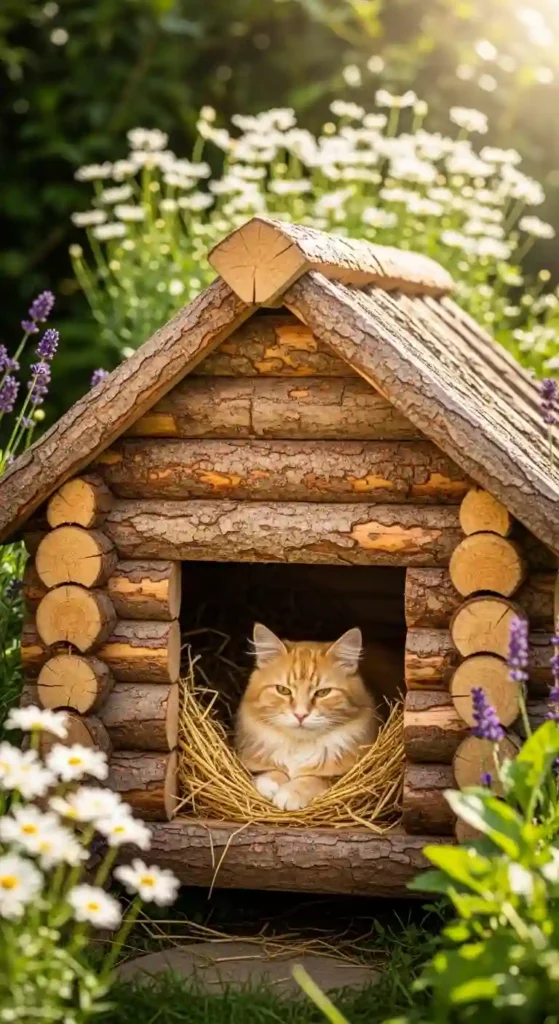 7. Rustic Wooden Cabin-Style Cat House