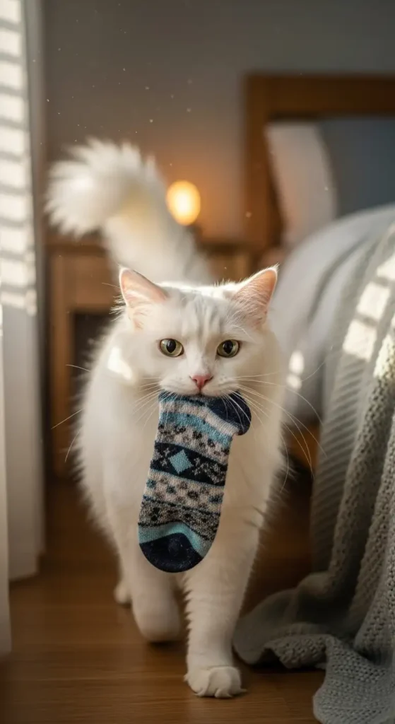 This white kitty looks calm and sweet, but mysteriously steals socks when no one’s watching. You’ll find their secret stash under the bed.