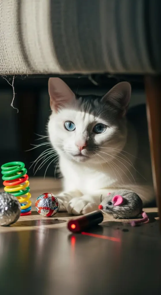 This kitty secretly steals toys and hides them under furniture like tiny trophies.