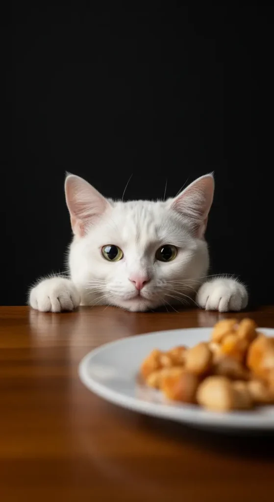 With wide eyes and a gentle meow, this white cat convinces everyone they haven’t been fed—twice.