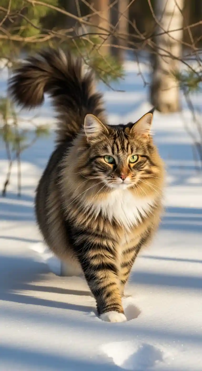 The Norwegian Forest Cat has a thick, long coat built for cold climates.