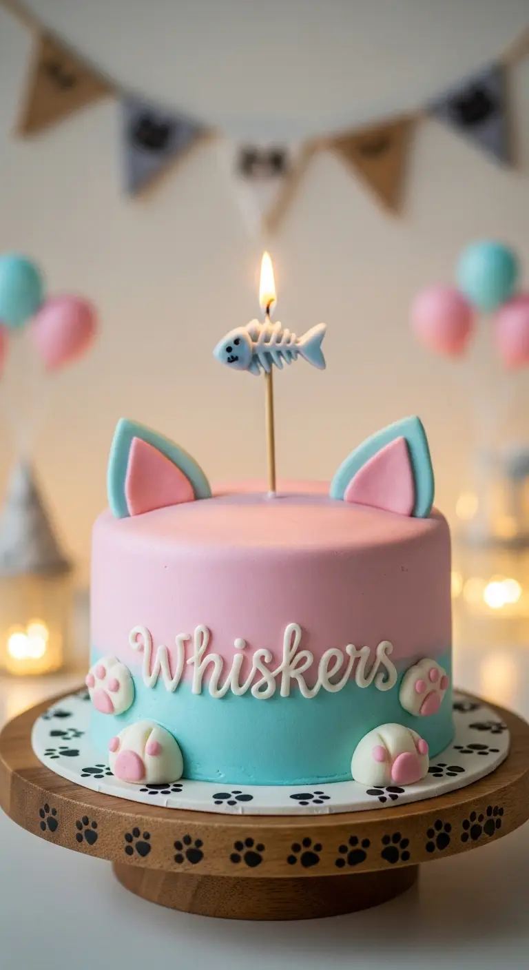 Design a round cake with a simple cat face using frosting for eyes, whiskers, and ears. Keep colors soft and playful.