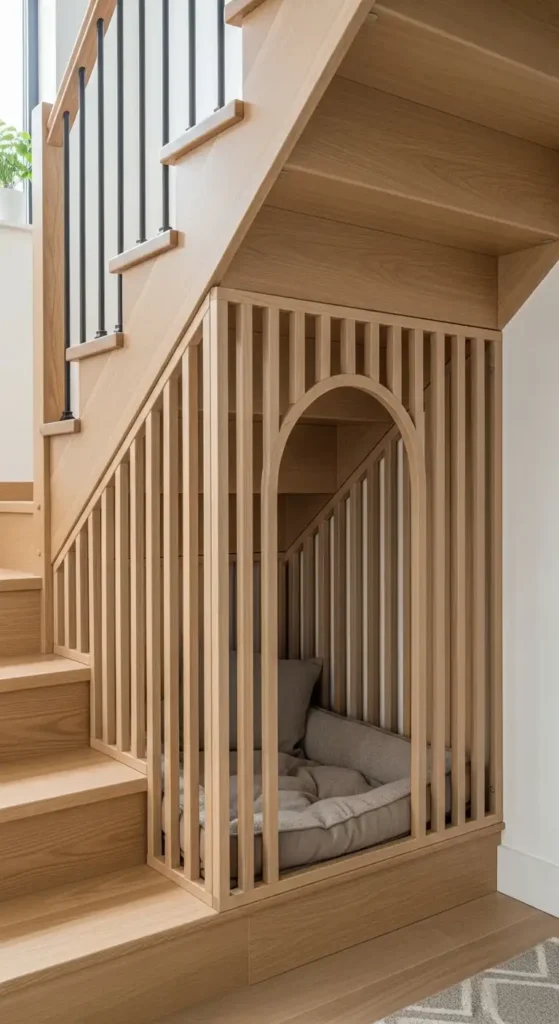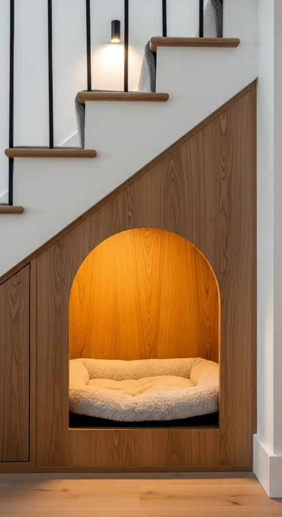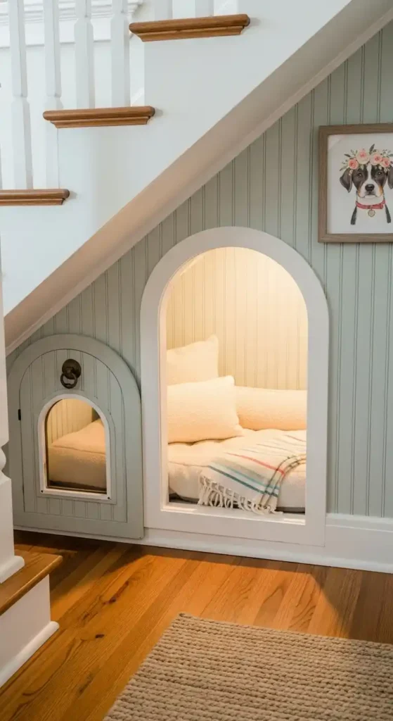 Unused space under the stairs can become one of the most charming spots in your home—especially for your dog. Under-stair dog nooks combine smart storage with comfort, giving your pup a quiet, secure retreat that feels like their own little room.