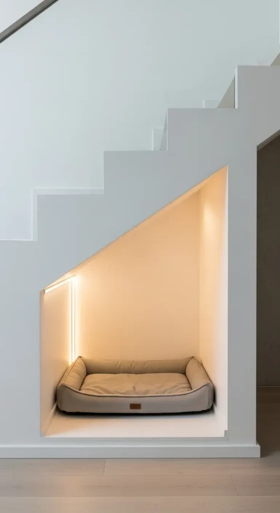 Clean white walls, built-in lighting, and a simple dog bed create a sleek, modern look. This style works beautifully in contemporary homes and keeps the space feeling calm and uncluttered.