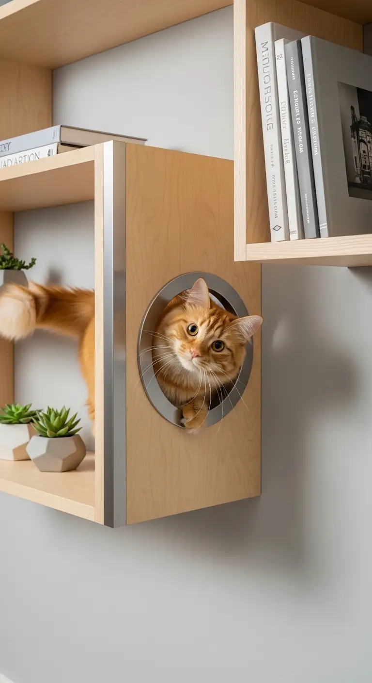 Design a cat door within a wall shelf or storage unit. It combines functionality with design.