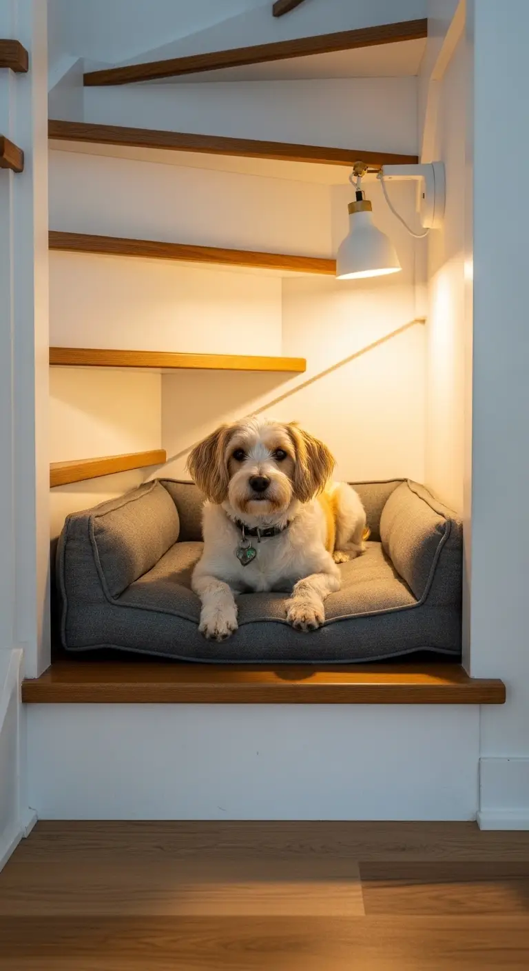 Design a built-in crate under the stairs using wooden panels or a simple frame. Add a soft mat inside for comfort.