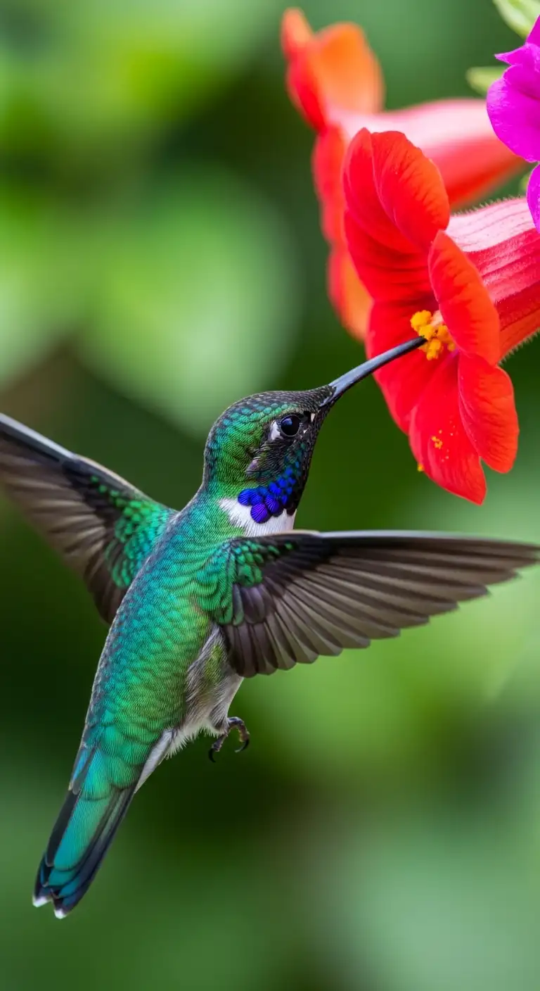 Hummingbirds are tiny birds with shimmering feathers that change color in light. Their ability to hover makes them unique.